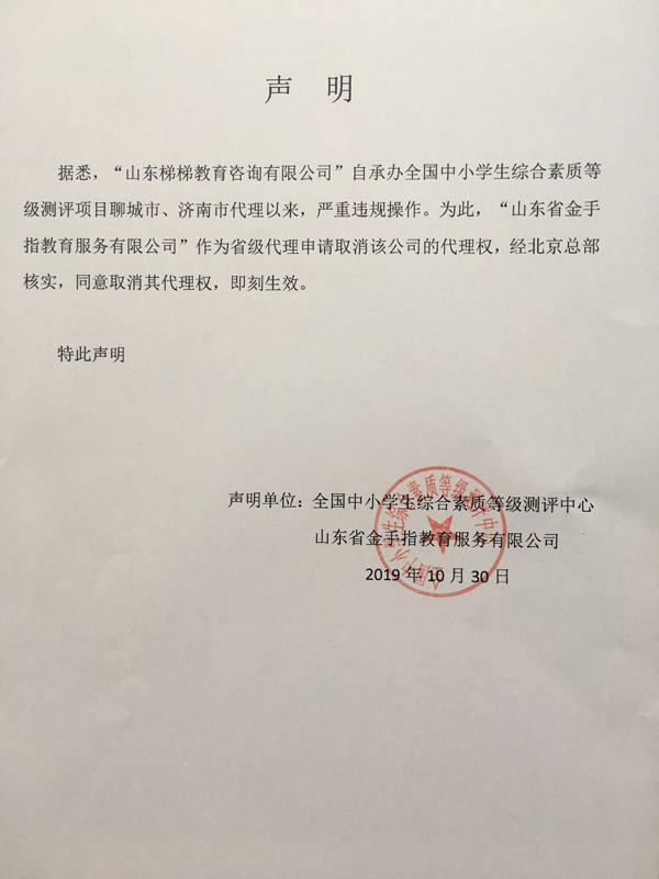 据悉,“山东梯梯教育咨询有限公司”自承办全国中小学生综合素质等级测评项目聊城市、济南市代理以来,严重违规操作。为此,“山东省金手指教育服务有限公司”作为省级代理申请取消该公司的代理权,经北京总部核实,同意取消其代理权,即刻生效。